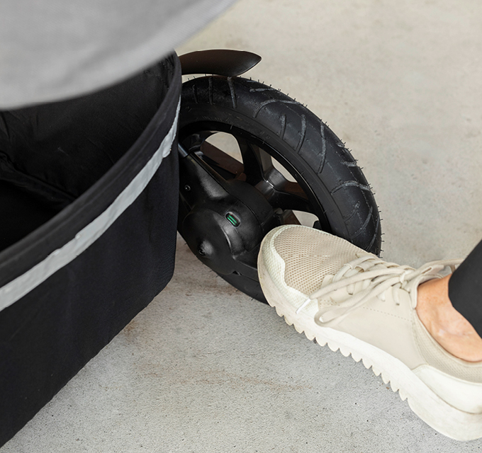 Передня і центральна підвіски в поєднанні з надувними колесами забезпечують м'який і плавний хід на будь-якому типі доріг. Ззаду розташованиі зручні гальма фліп-флоп.
